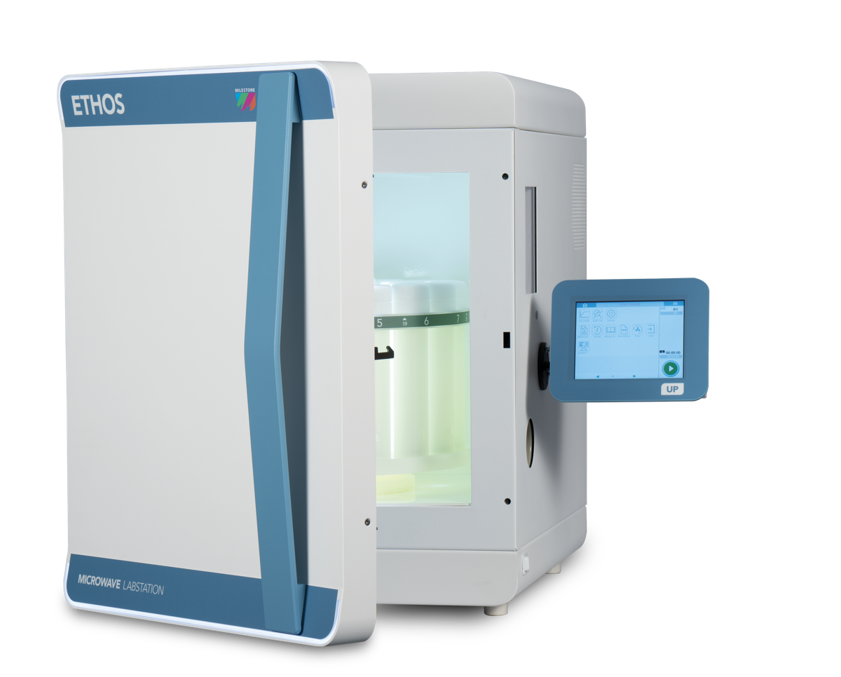 High power up to 1900W digestion apparatus with two magnetrons, operating in atmospheric, middle or under high pressure (two models, ETHOS UP & ETHOS Easy, ETHOS Lean, ETHOS Plus). Large cavity volume of 70lt, high quality safety standards & contact less recording of the temperature in all sample vessels (EasyTemp). A wide variety rotor selection depending on the application, the temperature and pressure conditions, the volume and the number of the samples, up to 44 positions!